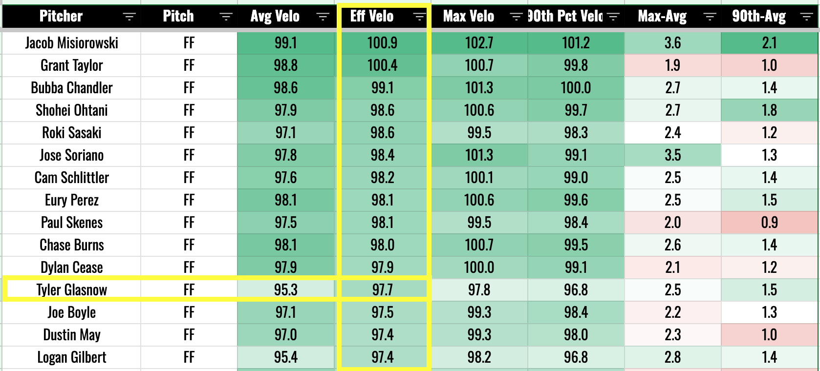 Only 19 starters (18 if you don’t count Grant Taylor) have effective velo on the FF over 97. But he’s not using that pitch that much! Why not, Glasnow? Throw the fastball!