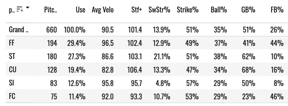 So that’s a pretty nice combo. A 50.6% Strike% and 34.5% Ball%. The ground ball rate is at 50% to boot.