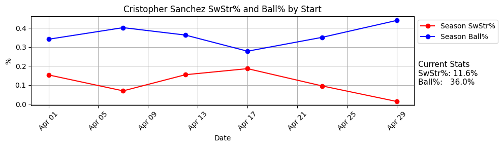 An 11.6% SwStr% is not very good, and the ball rate is at league average. So there’s not much to love here, Sanchez does seem like he’s going to have the breakout season that many expected.