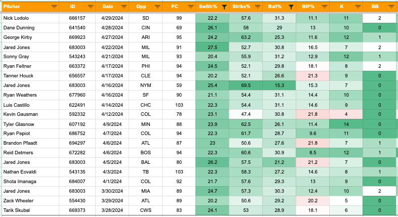 Given that ridiculousness, I am going to query the 2024 Individual Start Data table and see how many times a pitcher has gone >20% SwStr% and <32% Ball% this year. The answer is 21:
