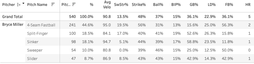 5 IP, 2 H, 2 R, 7 K, 1 BB, 16.9% SwStr%, 31.2% Ball%