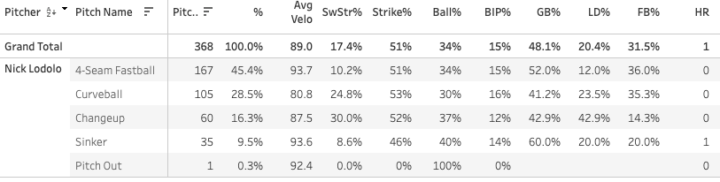 1. Nick Lodolo (CIN): 57.6 Strike%, 31.3 Ball%