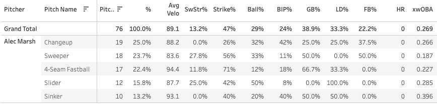 Alec Marsh's ST velo (18 pitches) DOWN -2.2mph to 83.6
