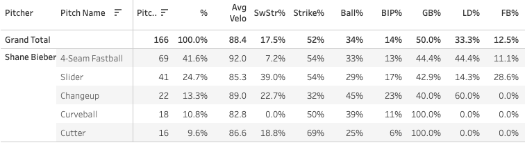 Shane Bieber - 45 TBF, 50.0% GB%