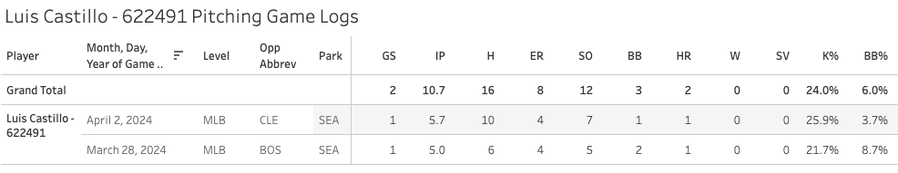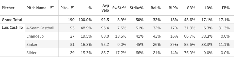 I wouldn’t worry though. The SwStr% is low, but this is Luis Castillo we’re talking about, a known commodity. The one thing to note and monitor is the fastball velocity, which is down from 96 to 95.