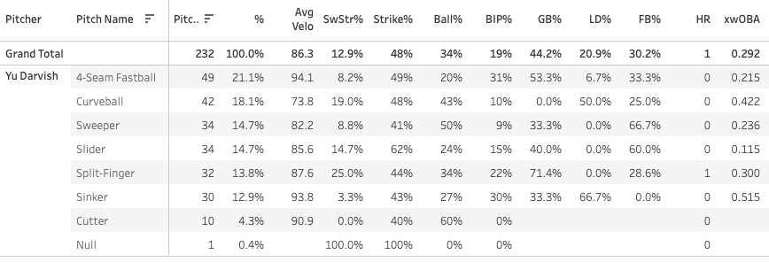 Yu Darvish - 63 TBF, 44.2% GB%