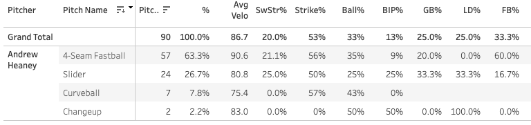 Andrew Heaney's FF velo (57 pitches) DOWN -1.9mph to 90.6
