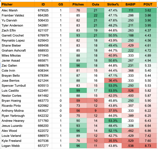 1. Alec Marsh: 76 Pitches, 21 Outs, 3.62 POUT