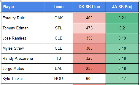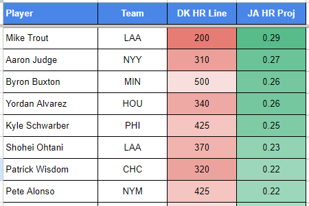 Another change from yesterday is that I added a bunch of stuff onto the prop betting sheet. We now show lines and projections for strikeouts, total bases, homers, steals, and RBI.