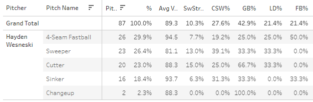 Hayden Wesneski's FC usage (31.2%) up 13.4 points