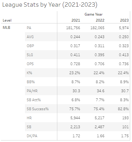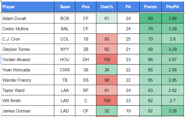 New resources available today for paid subs! I whipped up a script to calculate fantasy points scored for hitters and pitchers. For every qualified player, it will show you how many fantasy points they have scored and the rate of scoring as well (per PA for hitters, per GS and per IP for pitchers). The scoring system I used is DraftKings scoring, which is pretty close to what you’ll find in standard points leagues.