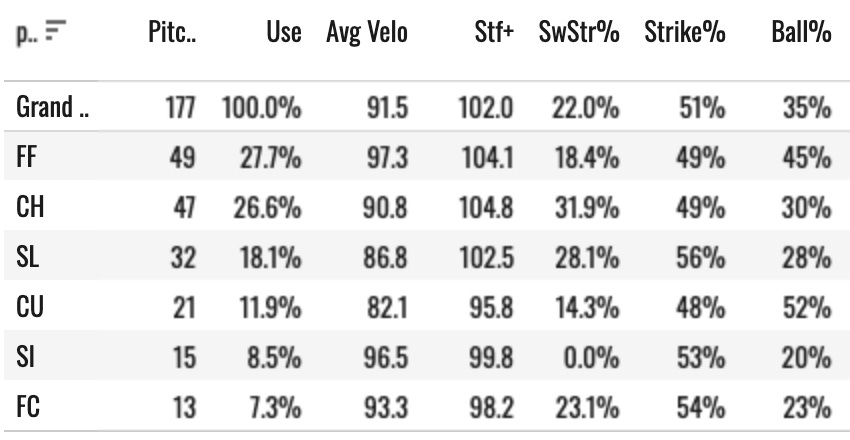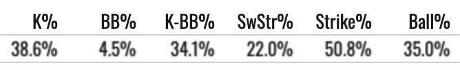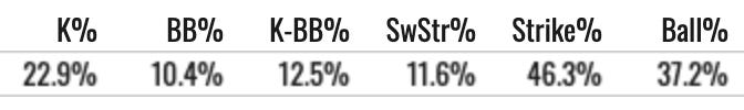 Kind of a red flag on the 45% Ball% on his four-seamer. I’m not sure how he’s only walked the two batters throwing his primary pitch for balls so frequently. The changeup and slider both look good, and those are the ones he’s thrown for strikes. But that’s weird stuff.