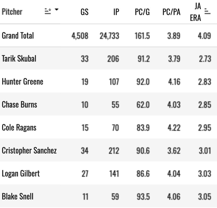 As for Burns, we shouldn’t be surprised at the dominance. His MLB career SwStr% is now up to 17.6% with a better-than-average 35% Ball%. He’s extremely good. One of the most talented pitchers in the world. His JA ERA from 2025-2026 ranks third best behind only Skubal and Greene.