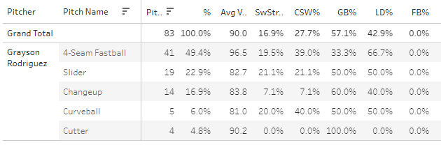 Grayson Rodriguez actually looked pretty good after a bad first inning. HE went for a 16.9% SwStr%.