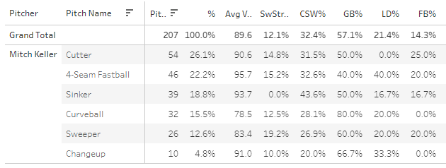 Mitch Keller also had another nice start, although without a ton of whiffs, here’s his season pitch breakdown: