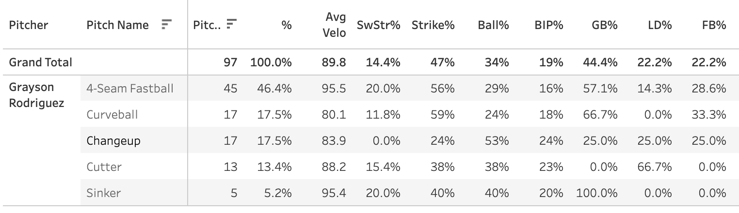 5. Grayson Rodriguez: 97 Pitches, 19 Outs, 5.11 POUT