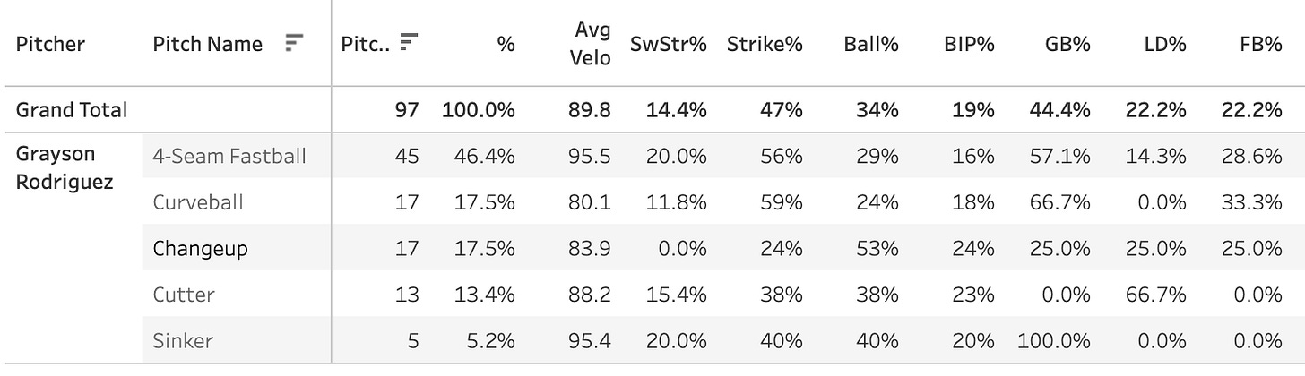 What got him were two solo homers, and I think that’s going to be a thing he has to deal with. Four-seamers and sliders get hit in the air a lot, and he keeps a lot of his fastballs up in the zone, so while it’s a good trade-off for having that elite stuff, the homers are going to come. He was beat by Grayson Rodriguez, who wasn’t as dominant but was more effective overall.