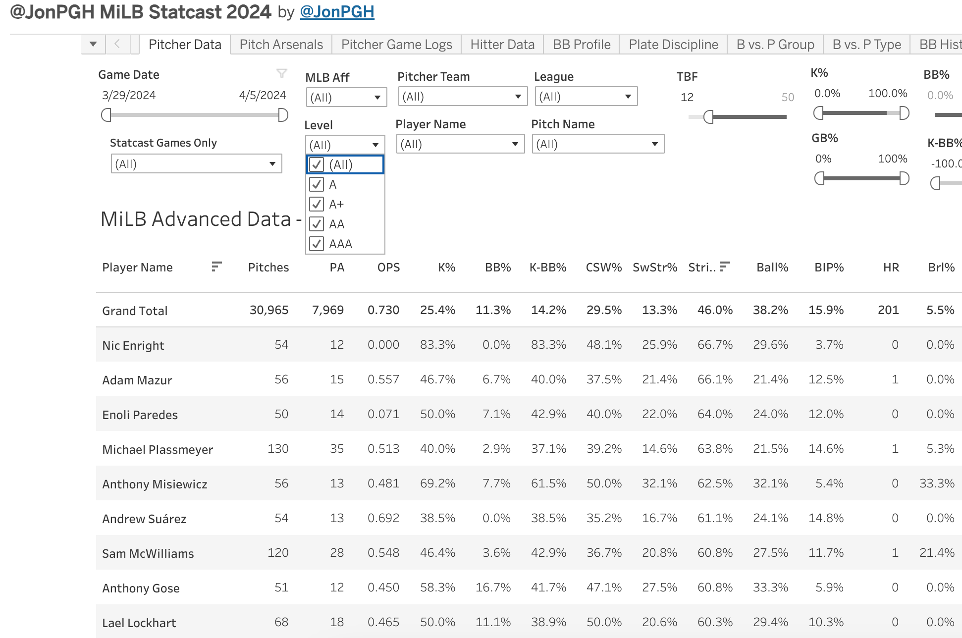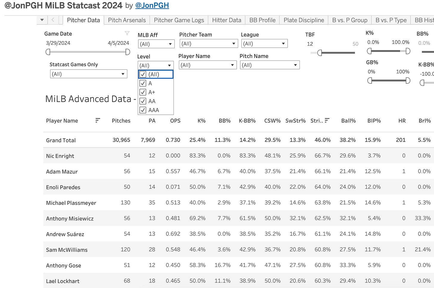 The AA, A+, and A seasons started last night, so the MiLB Statcast dashboard is fully alive. It has advanced metrics on all minor league games. We still only have Statcast in AAA and in the Florida State League (A ball), so you don’t get exit velocities and barrels and the like, but you do get SwStr%, Strike%, and Ball% data for pitchers and good plate discipline stuff on hitters.