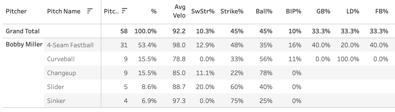 Bobby Miller got KO’d in the second inning. He didn’t have command with a horrid 45% Ball%.