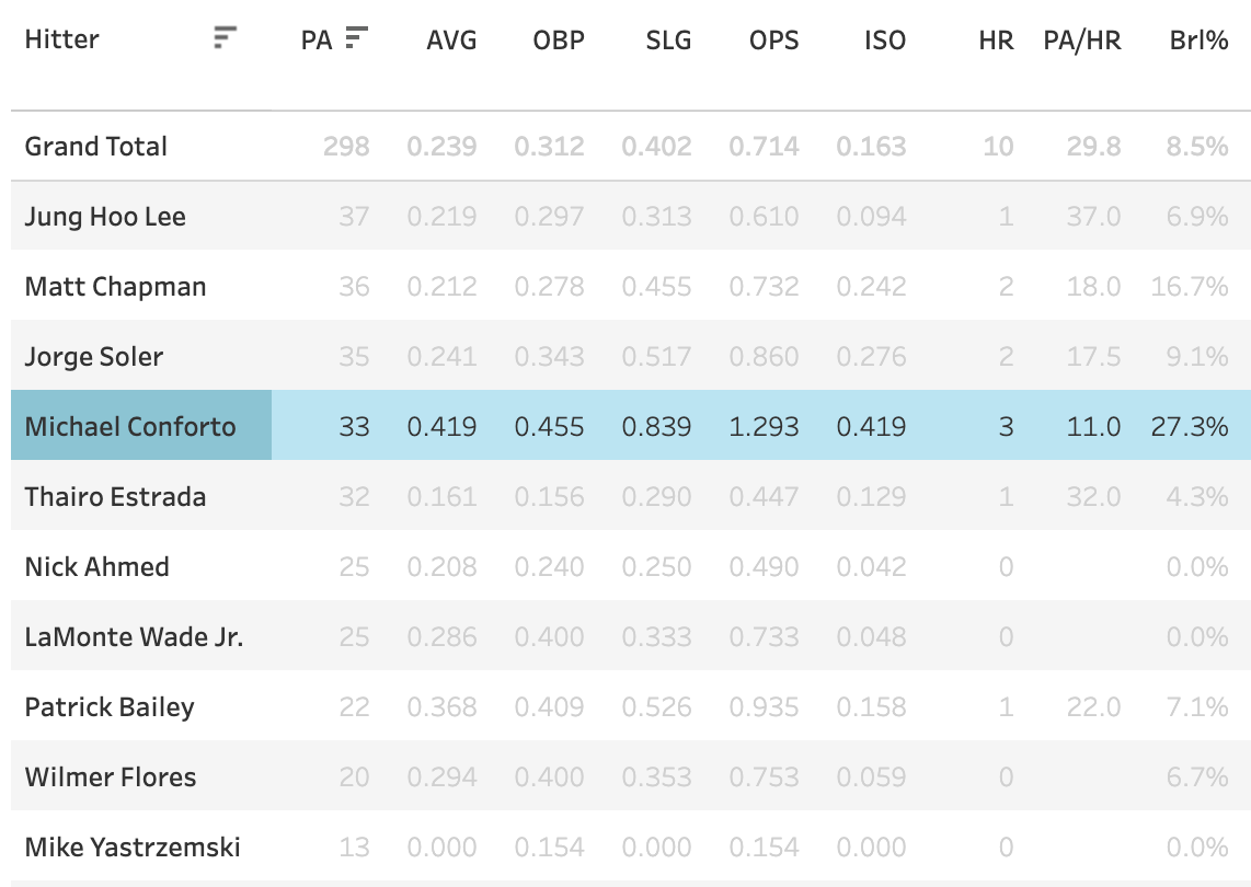 Michael Conforto had two more barrels yesterday and is now at a 27% Brl% with an OPS near 1.300.