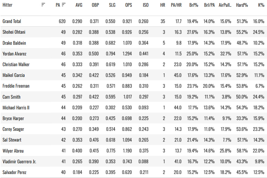 It’s not easy to go for a high barrel rate and a lower K% even in a two-week sample. The full list of hitters so far with: