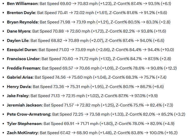You can feed that data to an AI bot and ask it questions. I looked for the guys with improved bat speed AND zone contact to try to find the dudes swinging harder who haven’t given up contact abilities so far: