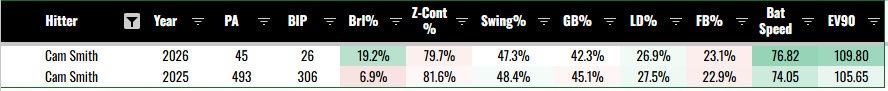 I put together a little stat comparison sheet in the main Google Sheet workbook for all of you paid subs. It’s called “Hitter Stat Comp”, and it will show you rows for 2025 and 2026 of these stats: