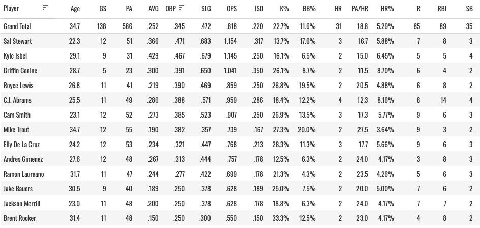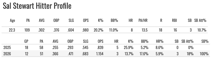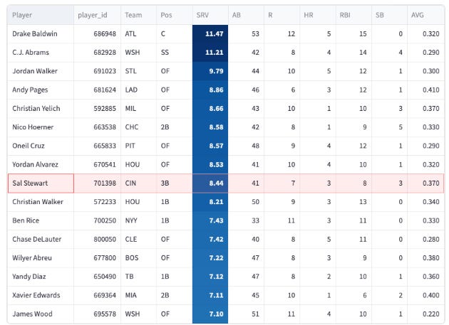 Wow it’s Sal Stewart! He homered and swiped a bag yesterday to get him to three homers and three steals. Only CJ Abrams, Cam Smith, and Elly De La Cruz have three homers and three steals.