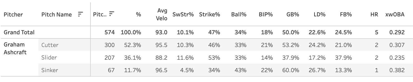 Graham Ashcraft did it yet again. He had seven strikeouts and 18 whiffs this time. Seven strikeouts is his second-most of the season (he’s done that three times now). Here’s what the pitch mix has looked like since the all-star break