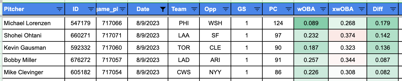 But I can’t be all nice here. He had just a 10.5% SwStr%. Every no hitter is going to involve a lot of good luck, so it’s no surprise to see that Lorenzen was the luckiest pitcher of the day by wOBA vs. xwOBA:
