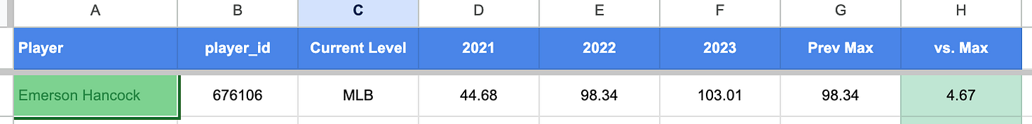 He had a pretty solid debut with five innings and just one run, but the 3:3 K:BB wasn’t impressive, and the 12.6% SwStr% is just okay. He did earn a lot of strikes and keep the ball on the ground - so pretty interesting stuff there. The sinker with a 15.7% SwStr% is wild - that’s incredibly high for a sinker. So either this is not a standard sinker, or it was a very lucky night for him. I didn’t watch any of the game - so I can’t speak to what the pitch looks like. But we’ll see what he does from here forward - there’s definitely a rotation spot for Seattle with Woo on the IL, and Hancock probably has 30 good innings left in him given that’s only at 103 this year and threw 98 last year: