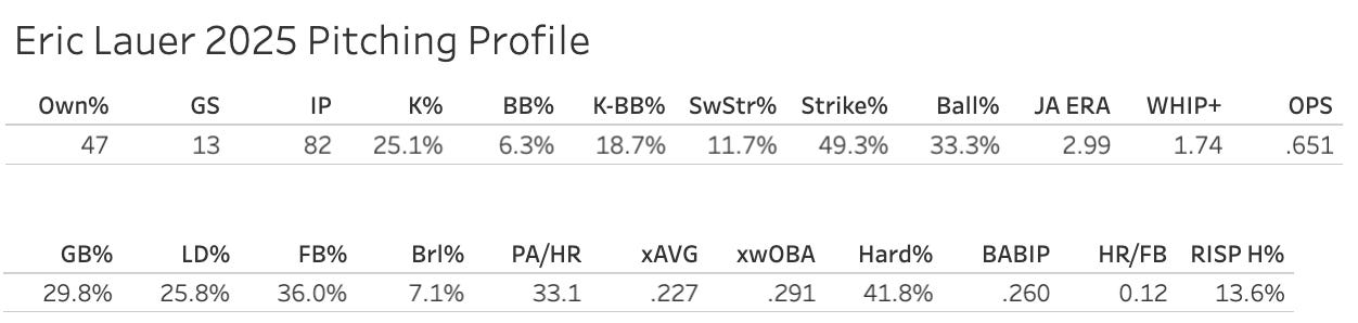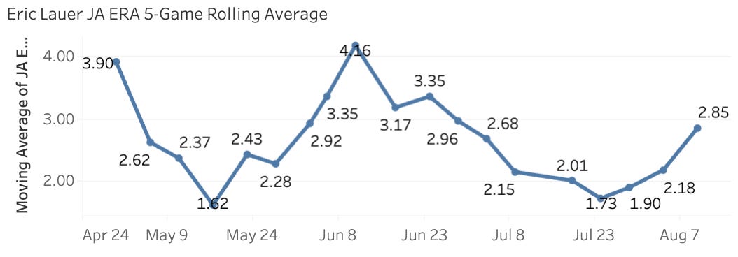 We have kept a close eye on Lauer this year. And he’s a lot better than anybody thought, but the good luck he was having was bound to dry up, and he doesn’t have anywhere near the level of stuff to perform well while having league-average “luck”. I’m not saying we should dismiss him entirely because he got hit around by the Dodgers, and the JA ERA still sits at 2.99. But it’s not going to be at all surprising if he’s quite bad the rest of the way home.