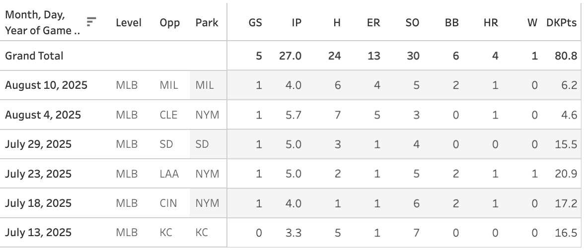 Jonah Tong (NYM): 0 Pitches, 5IP, 3H, 1ER, 8K, 0BB, 23FPts