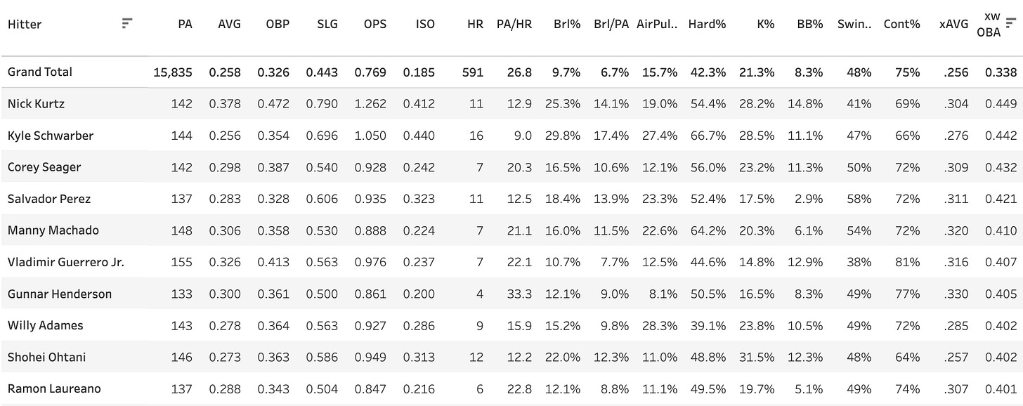 Trent Grisham - 0.424 xwOBA, 19.4% Brl%, 75.9% Contact%, 16.8% Chase%, 18.5% K%