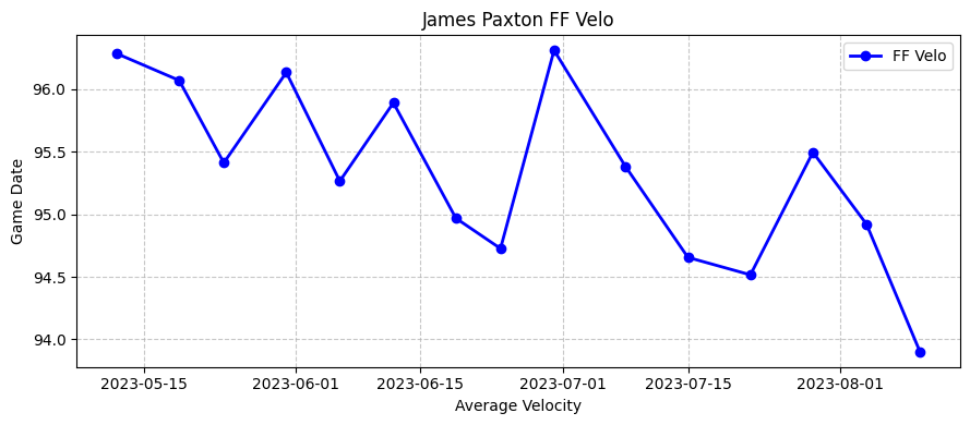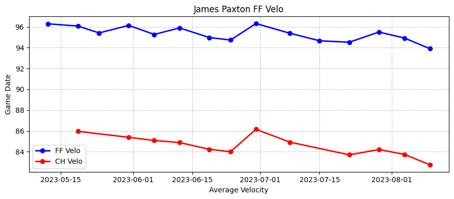 We see here that Paxton lost some velocity there. I used this opportunity to ask ChatGPT for some Python code to make a nice looking line plot, since mine are usually not very appealing to the eye.
