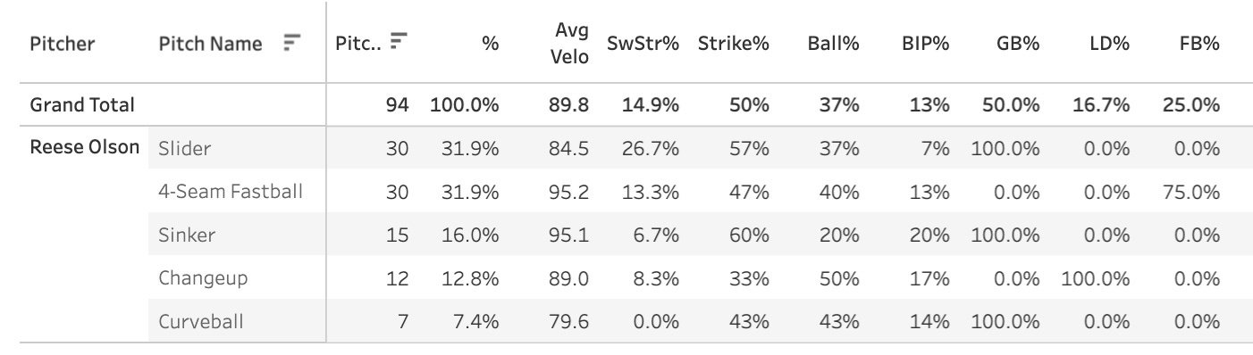 It’s not a good thing when a hitter can guess when a fastball is coming, and only a small percentage of pitchers can get away with that at the Major League Level. I don’t think Olson is there yet, so he’ll need to improve that pitch - but the good news is that his slider is good enough to keep his head above water for now.