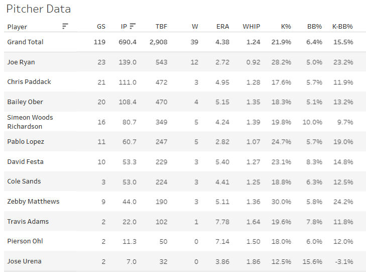 Really rough year for the Twins on the pitching front. If you told Minnesota bro’s at the beginning of the season that Byron Buxton was about to have his healthiest season, they’d have been pumped about the potential they had going into the season with this pitching staff. Here are the numbers on all Twins pitchers who have made at least one start this year.