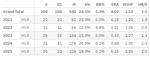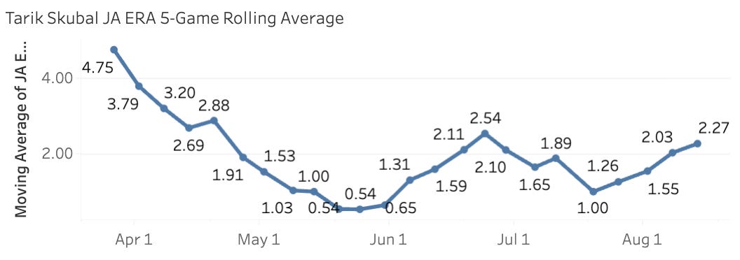 He has given up 10 earned runs in his last three starts, now with a 19:4 K:BB. He’s still holding really strong with the JA ERA under 2.30 in the last five, and that rolling five-start JA ERA hasn’t been over at all this year if you look at a five-start sample.