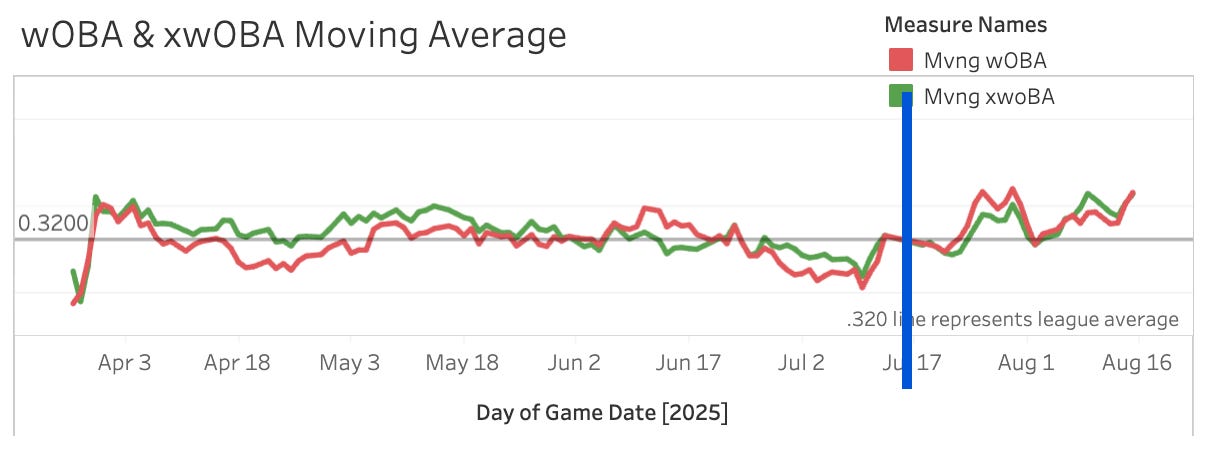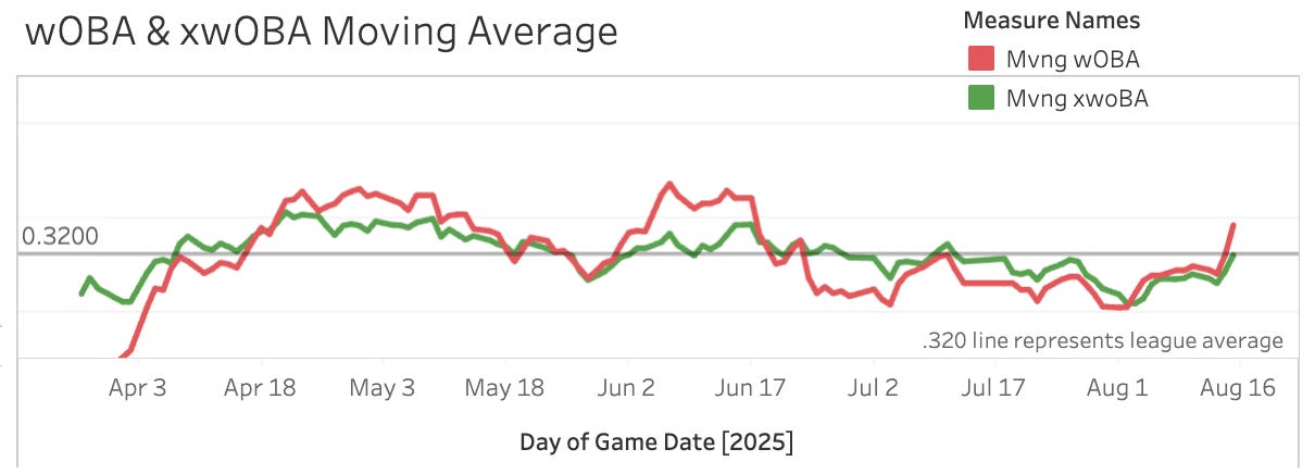 Maybe we’ll see Francisco Lindor get going. He has eight hits and three homers in his last three games, and if you look really close at the end of this plot you’ll see those lines beginning to shoot upward.