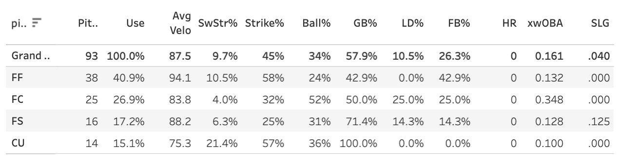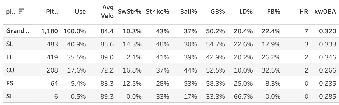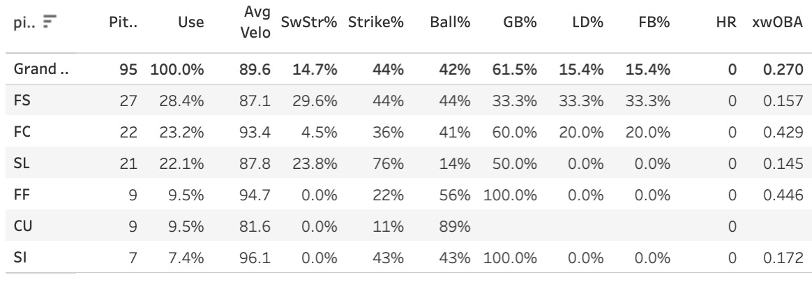 So he’s throwing a ton of non-fastballs. The cutter can be called a fastball but it can play more like a slider with some guys. But he’s at just 16% four-seam and sinker usage, throwing a ton of splitters and sliders. That’s interesting. I don’t think it makes him a reliable traditional SP, and it will probably turn into inefficiency and walks. So I’m not too high on him, I guess that’s what I’m saying.