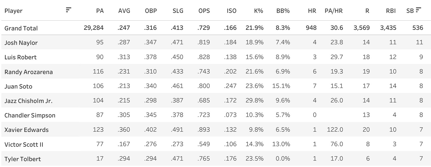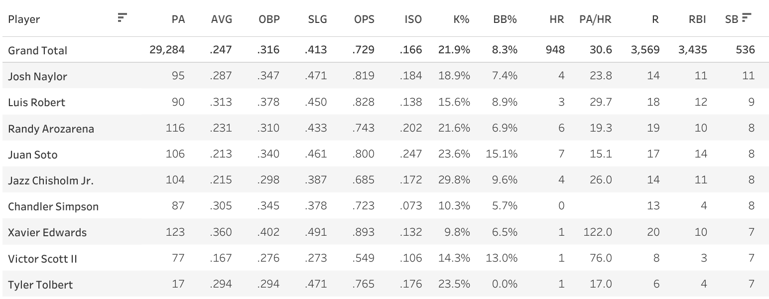 That’s right, third-percentile sprint speed Josh Naylor leads with 11 swipes.