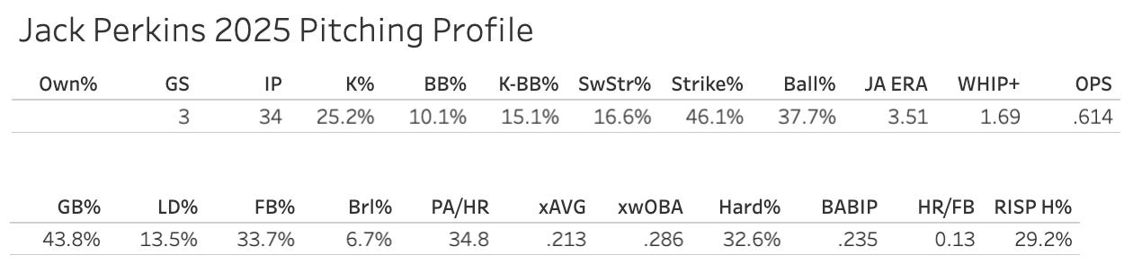 18 whiffs for Jack Perkins and a win, but nothing else was that good. A 40.8% Ball%, five hits, and three walks given up in five innings. Full season update: