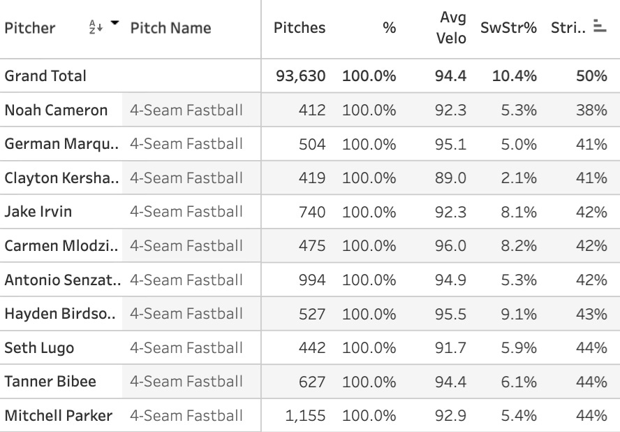 That’s the lowest SwStr% and third-lowest Strike% for any four-seamer thrown at least 400 times this year.