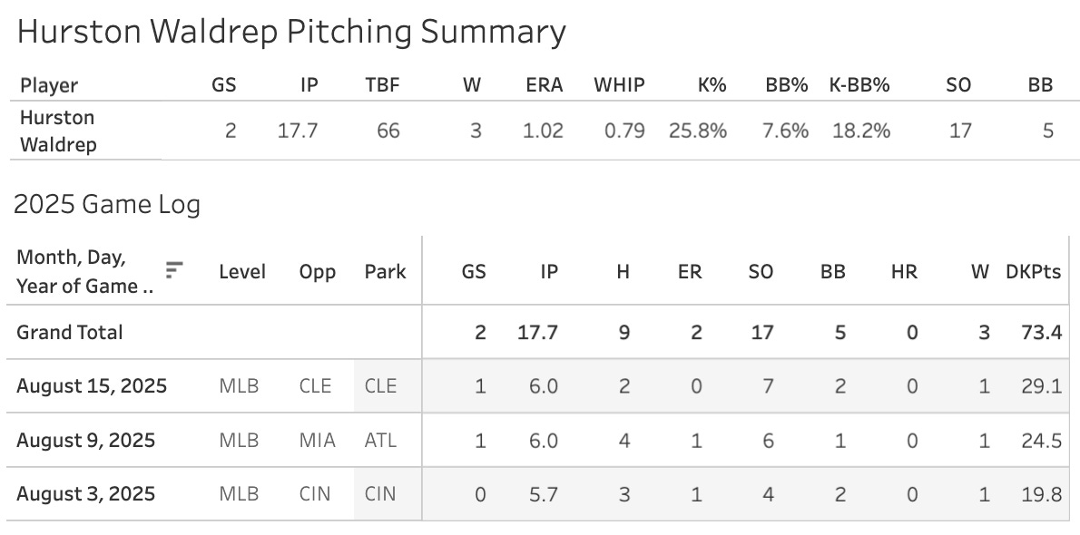 Hunter Patteson (KC): 0 Pitches, 5IP, 2H, 0ER, 6K, 1BB, 25FPts