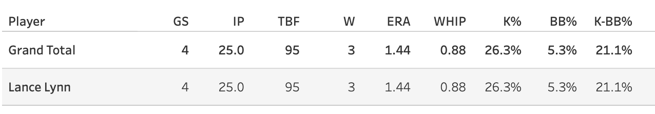 It’s all worked so far, but the lower SwStr% isn’t something you love to see, so I don’t know - I wouldn’t be surprised to see Lynn struggle a bit more down the stretch, but hopefully, you got your hands on him right after the trade (like I did, shout out to me for being stubborn).