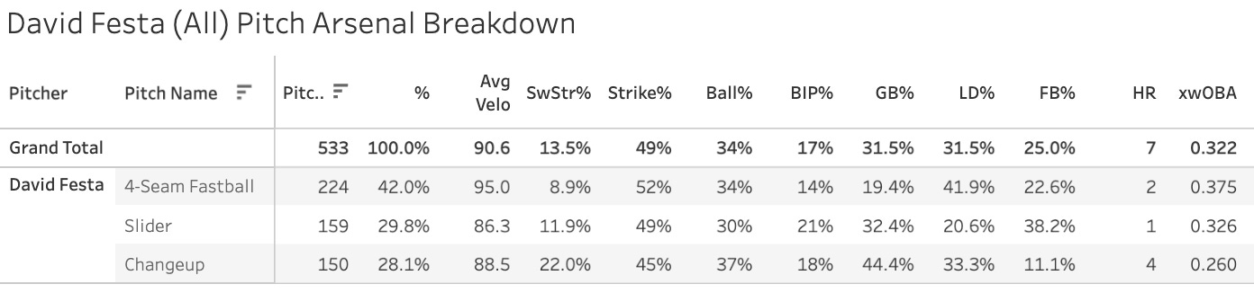David Festa led the day with an 18.5% SwStr%, so he jumps immediately back onto our radar. His outings so far:
