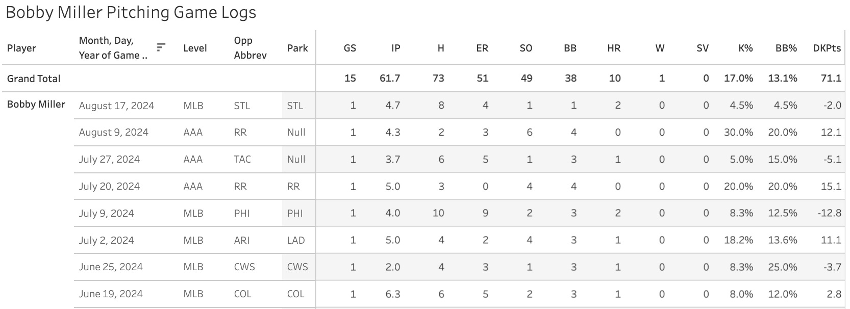 The one walk is a good sign, but underneath it was a very, very bad 44% Ball%. The 34% Strike% is one of the worst marks you’ll see. He would appear to be very, very broken. His last handful of game logs are terrifying, especially given that a lot of them are from the minor leagues: