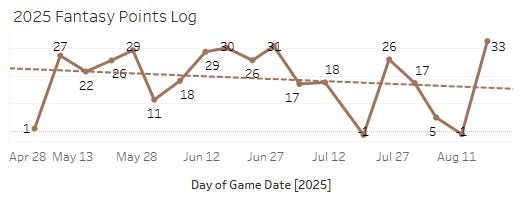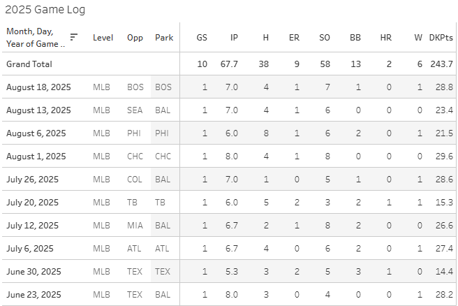 The most striking thing in the pitch is the 7.7% SwStr% he has on the fastball. He is pretty dependent on that slider, which is not a good situation. Hitters can sit on the heater, and it hasn’t been good enough for that not to matter like years past. Hitters are slugging .511 with a .394 xwOBA on the fastball. I was super wrong about Strider. I really thought he was back to SP1 status in mid-June after he seemed to come out of that early funk.