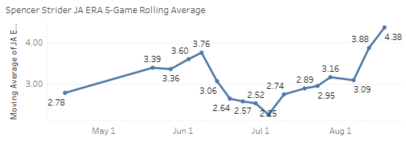 Strider is still getting a bunch of whiffs. He has an elite 15% SwStr% this year. But the command is bad. He has a 38% Ball% now with a 9.2% BB%. And command isn’t just about walks. He’s clearly been throwing meatballs up there. He’s given up 17 homers in 88 innings (1.7 HR/9). The combination of walks and homers… that’s not a good thing to be doing.