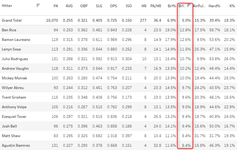 Trent Grisham - 0.389 xwOBA, 10.8% Brl%, 80.2% Contact%, 19.8% Chase%, 18.9% K%